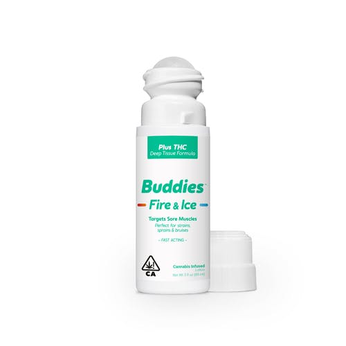 Buddies Fire & Ice Roll-On Topical. Buddies award-winning Fire & Ice Topical. From athletes to grandmas, this 1:1 (250mg CBD/250mg THC) topical does wonders for wellness. Fire & Ice is all-natural, has therapeutic strength, and is long-lasting. It is non-greasy, has an easy roller application, and is enhanced with organic essential oils.